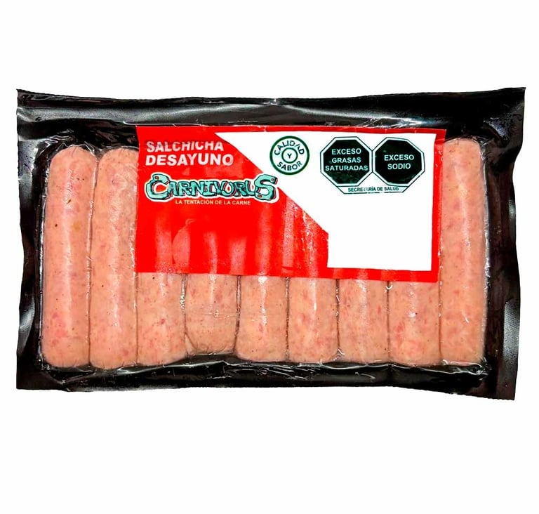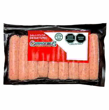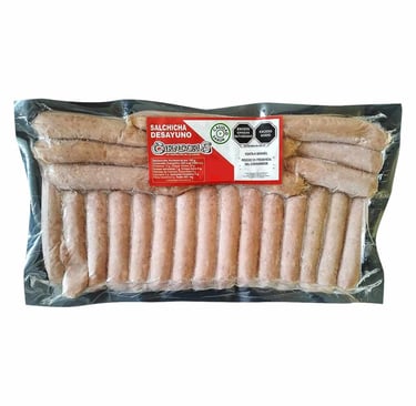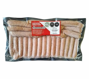 La salchicha tipo desayuno, es un producto precocido de, carne y grasa de cerdo, especias naturales, embutida en funda de celulosa de grado alimenticio.