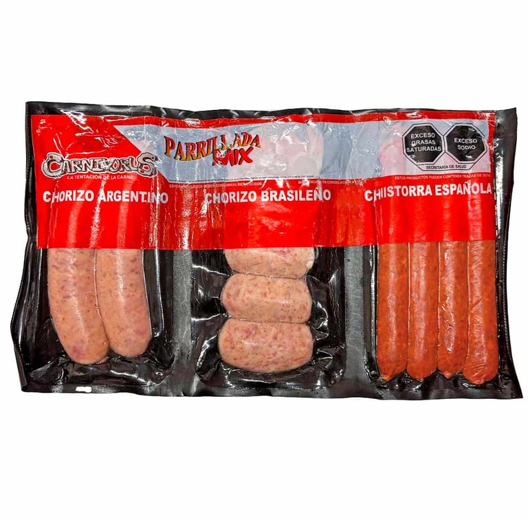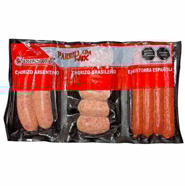 Parrillada mix, es una presentación que incluye tres deliciosos productos precocidos : chorizo argentino, chorizo brasileño y chistorra española, los cuales están elaborados cuidadosamente con ingredientes de la más alta calidad, lo que garantiza su exquisito sabor.
